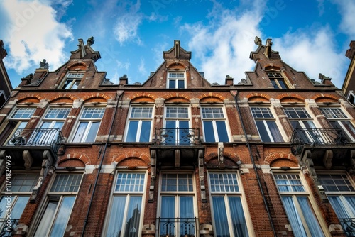 Traditional dutch house facade made of bricks with gables and balconies under blue sky