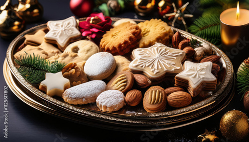Traditional European cookie platter featuring assorted Christmas treats and marzipan shapes on a festive table