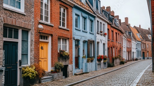 Traditional European townhouses with colorful facades and rustic charm, lining a narrow cobblestone street.