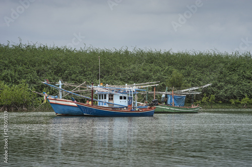 traditional fishing boat on the sea with mangrove forest in background.cloudy sky.filtered image.selective focus