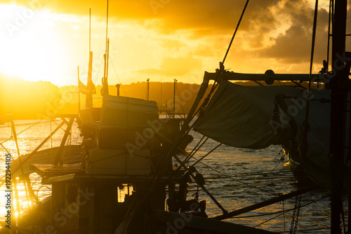 Traditional fishing boats resting along the coast of Itacaré, Bahia, Brazil, under strong yellow sunlight. The intense tropical sun creates golden reflections on the ocean surface, highlighting the vi