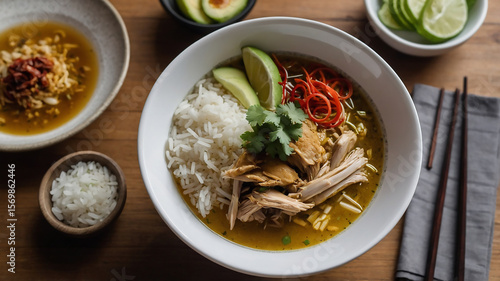 Traditional Indonesian chicken soto with rice, served in a clean bowl with a professional restaurant atmosphere, Ideal for culinary magazines, food delivery interfaces, or menu designs