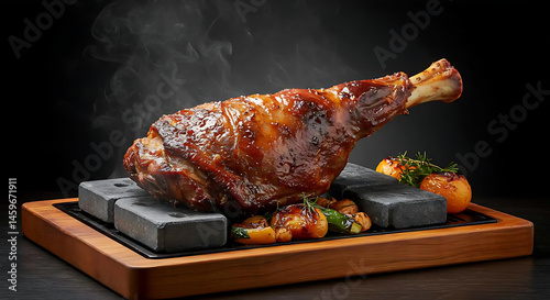 traditional Mongolian khorkhog style, with visible hot stones and glistening meat fibers. Steam and rich textures make this image ideal for gourmet and editorial use.
