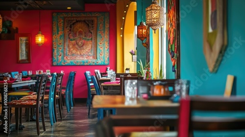 Traditional South Asian restaurant interior with vibrant colors and cultural decor. No people, copy space available