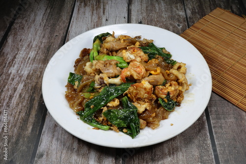 Traditional stirred and fried rice noodle with fresh Chinese kale, peeled shrimp, squid and chicken thigh serving on the plate. Famous special street food menu in Asia.