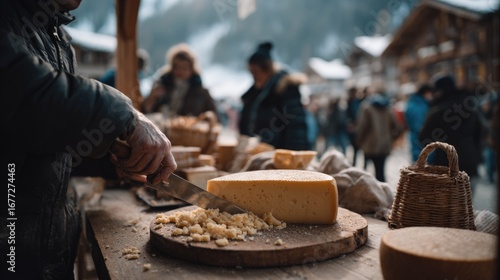 swiss, cheese, wheel, market, rustic, seller, cutting, knife, wooden, stall, rind, creamy, interior, slice, crumb, chunk, board, authentic, artisanal, product, small, rounds, basket, linen, clothes, inviting, atmosphere, coat, bustling, alpine, building, blurred, background, daylight, sheen, surface, grain, wood, freshness, tradition, craftsmanship, heritage, lifestyle, food, photo, cinematic, natural, shallow