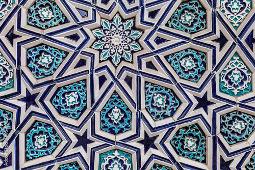 traditional Uzbek pattern on the ceramic tile on the wall of the mosque, background