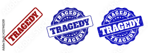 TRAGEDY grunge stamp seals in red and blue colors. Vector TRAGEDY labels with grunge style. Graphic elements are rounded rectangles, rosettes, circles and text labels.