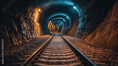 train tunnel, wide-angle lens, camera placed low near the tracks
