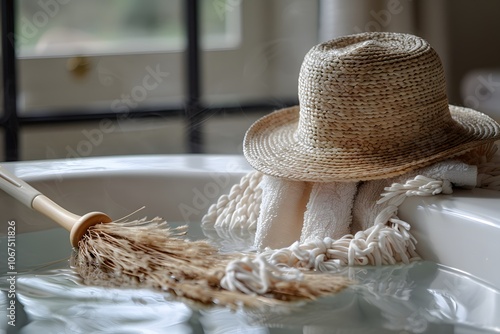 Tranquil Bath Scene with Straw Hat and Soft Towels