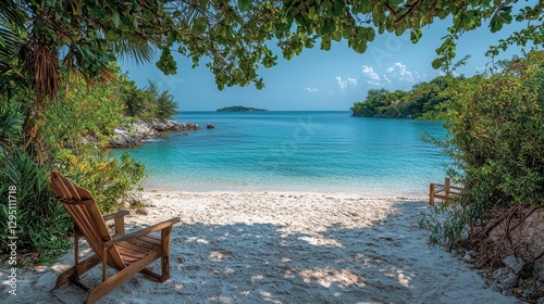 Tranquil beach scene with wooden chairs overlooking crystal-clear water and lush greenery