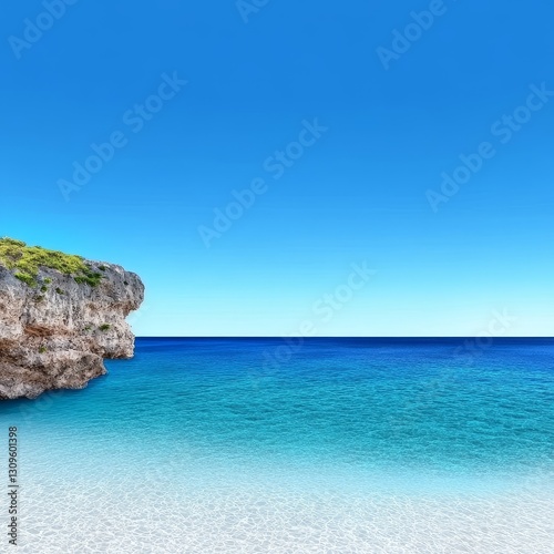 Tranquil Coastal Scene - Serene beach landscape with clear turquoise water and a rocky outcrop under a vibrant blue sky. Perfect for travel, vacation, or relaxation themes