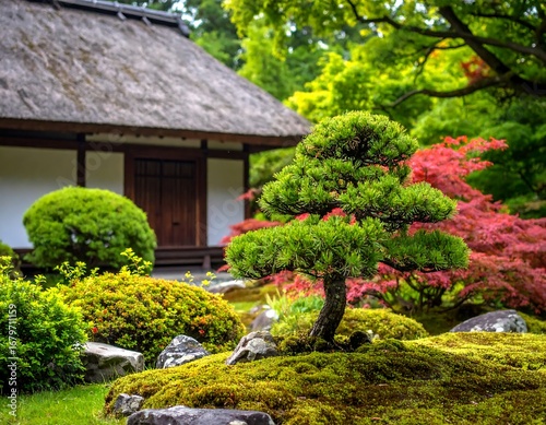 garden, japanese, zen, landscape, nature, tranquil, lush, green, tree, plant, flower, moss, stone, shrub, house, bungalow, roof, exterior, detail, colours, balance, peace, harmony, beauty, calm, design, masonry, scenery