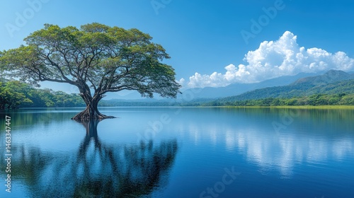 Tranquil lake, lone tree, serene landscape