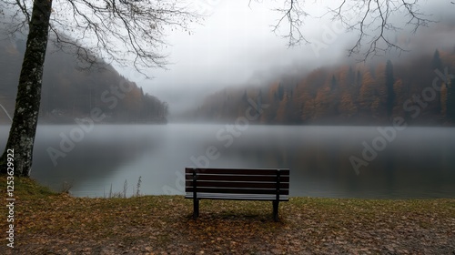 Tranquil Lake View with a Lonely Bench in a Foggy Autumn Landscape