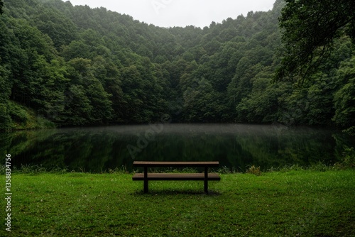 Tranquil lake view with bench in foreground surrounded by lush forest scenery
