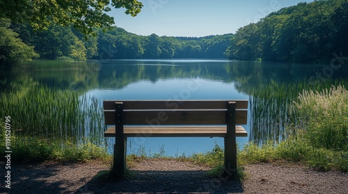 Tranquil lakeside bench overlooking calm waters and serene landscape during early morning hours