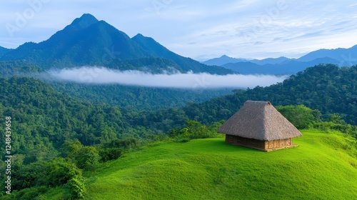 mountain, landscape, house, traditional, wooden, nature, serenity, greenery, rural, peaceful, sky, cloud, fog, hill, lush, scenery, summer, scenic, tranquil, bright, sunlight, remote, village, isolated, calmness, home, environment, natural, vista, open, panorama, beauty, travel, destination, relaxation, countryside, horizon, highland, forest, field, view, grass, eco, wilderness, exploration, retreat, solitude