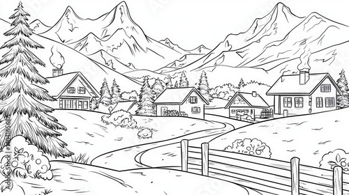 mountain, village, landscape, tree, cabin, snow, road, fence, nature, scenery, outdoors, vignetting, illustration, rural, home, calmness, peaceful, drawing, artwork, background, beauty, hill, greenery, water, flower, sky, cloud, architecture, environment, artistic, serene, view, detail, composition, sunlight, path, winding, forest, building, countryside, utility, flora, fauna