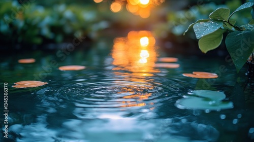 Tranquil pond ripples, sunlight through foliage, serene garden