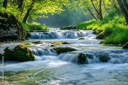 Tranquil River Cascades Through Green Forest with Sunlight Streaming Through Trees
