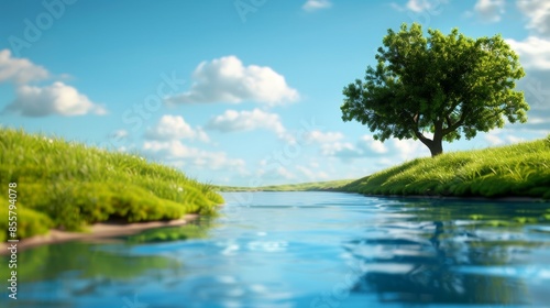 tree, river, water, sky, blue, green, grass, cloud, summer, nature, landscape, field, meadow, sunlight, sun, light, horizon, calm, peaceful, tranquil, serenity, relaxing, foliage, tree branch, rural, scene, idylli, beauty, picturesque, vibrant, natural, scenic, fresh, life, mood, scenery, serene, air, flora, environment, season, sunny, bright, cloud, timberland, outdoors, countryside