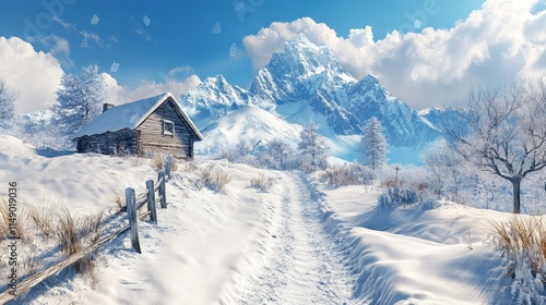 Tranquil Winter Landscape with Cabin and Majestic Snow-Capped Mountains