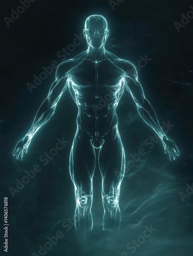semitransparent, silhouette, human, muscle, system, glowing, anatomical, visualisation, futuristic, figure, anatomy, science, art, design, medicals, technology, health care, body, health, light, energy, structure, concept, creativity, beauty, illustration, representation, digital, graphic, realistic, biology, shape, fiction, luminescent, skeletal, dynamic, movement, aethereal, projection, spacial, rendering, clarity, composition