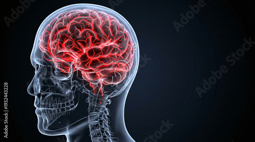 Transparent head with detailed glowing red vascular network inside brain, Brain Vascular Head Ache Concept