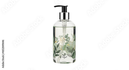 Transparent pump cleanser bottle with botanical print, isolated on white background