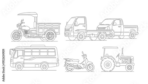 vehicle, transportation, car, bus, truck, motorcycle, travel, public transport, auto, automotive, driving, motor, scooter, tractor, agriculture, farm, road, street, commercial, good, cargo, passenger, van, delivery, journey, commute, movement, transit, system, structure, outline, line, style, drawing, illustration, design, artwork, graphic