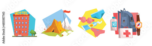 Travel and Tourism with Hotel, Camp, Backpack and Beach Stuff Vector Set