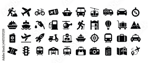 travel, transportation, icon, set, vector, holiday, journey, tour tourism, trip, vacation, adventure, transport, plane, car, boat, bus, train, bicycle, map, baggage, passport, ticket, camera, mountain, gasoline, scooter, ship, hike, compass, balloon