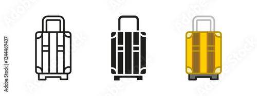 Travel baggage icon. Rolling suitcase for airport and trip symbol. Luggage for tourism, business, and transportation sign. Mobility packing vector illustration.