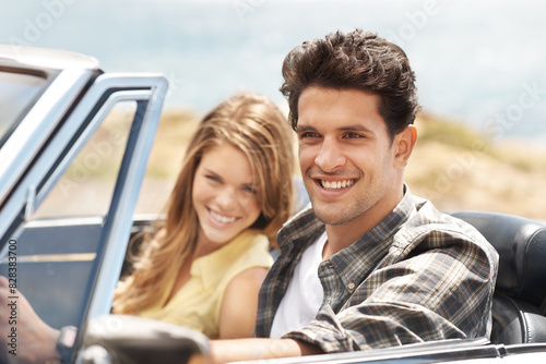Travel, couple and car for road trip, smile and bonding together with love, transportation and vacation. Holiday, outdoor and man with woman in vehicle, journey and adventure with driver and summer