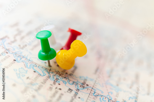 Travel destination points on a map indicated with colorful thumbtacks and shallow depth of field