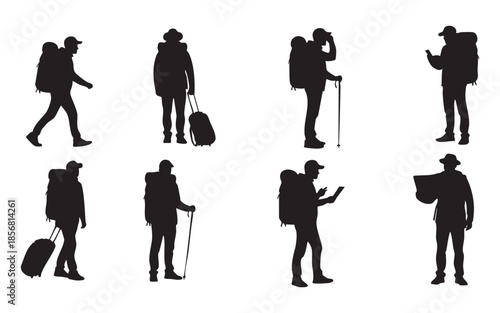 travel, traveler, travelling, tour tourism, holiday maker, backpacker, journey, trip, adventure, vacation, people, human, silhouette, baggage, suitcase, backpack, sightseeing, waiting, aerodrome, exploration, minimal, vector, isolated, white background