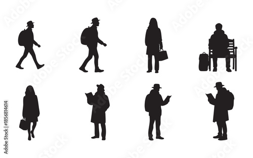 travel, traveler, travelling, tour tourism, holiday maker, backpacker, journey, trip, adventure, vacation, people, human, silhouette, baggage, suitcase, backpack, sightseeing, waiting, aerodrome, exploration, minimal, vector, isolated, white background