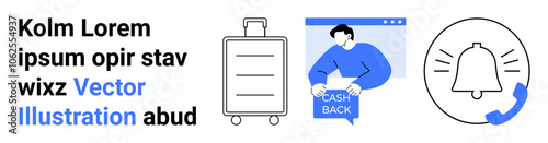 Travel suitcase, person holding Cash Back sign in browser window, bell notification with phone icon in black and blue colors. Ideal for travel apps, e-commerce, notifications, web design, marketing