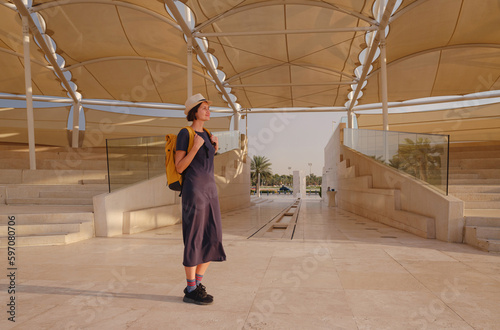 travel to the United Arab Emirates, Happy young asian female traveler with backpack and hat in Wahat Al Karama or Oasis of Dignity, permanent memorial for its martyrs, and Shaikh Zayed Grand Mosque.