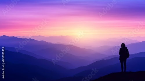 Traveler with backpack looking at mountain landscape at sunrise.