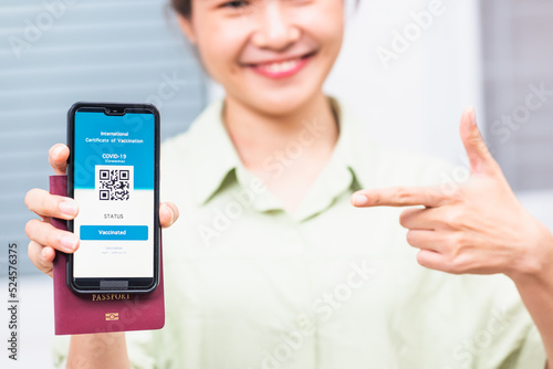 Traveler woman smiling holding health passport of vaccination certification on smartphone