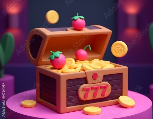 treasure chest with casino slot elements, (strawberry, cherry, 777, bar,)
