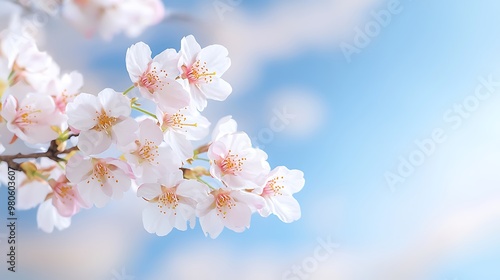 Tree branch covered in fresh pink blossoms, clear blue sky providing copy space for text, perfect for springtime advertising, deep depth of field