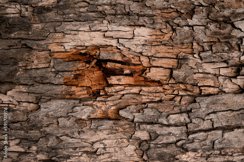 Tree rings old weathered wood pattern. brown bark wood texture. Embossed texture of the bark of oak. Horizontal photo of a tree bark texture. Relief creative texture of an old oak bark. home wall