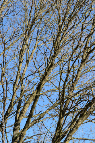 Tree trunk with bare branches and twigs in an european forest against blue sky on a sunny day, natural trees woodland landscape background