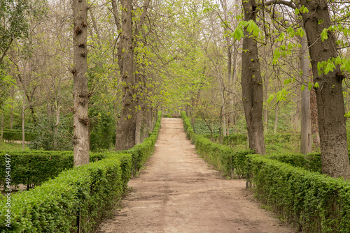 Tree-lined avenues of the Buen Retiro Park, in Madrid, Spain. There is no one in the boulevard.