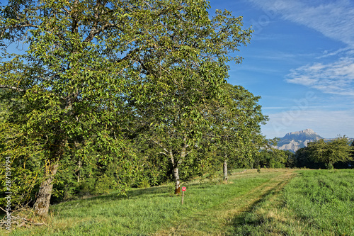 Trees and meadows in Belledonne, with Chartreuse summit in the background
