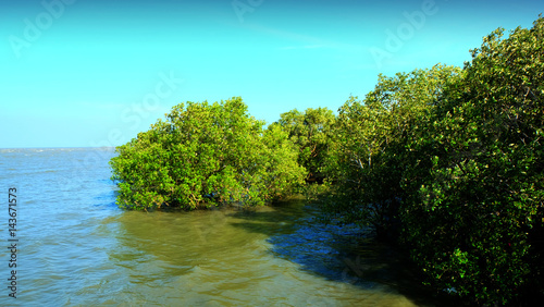 trees of mangrove forest and blue sky.