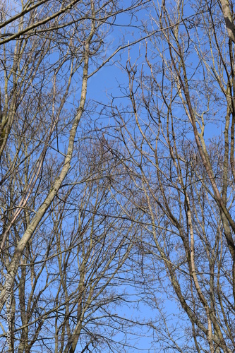 trees photographed from below on a sunny spring day with a blue sky